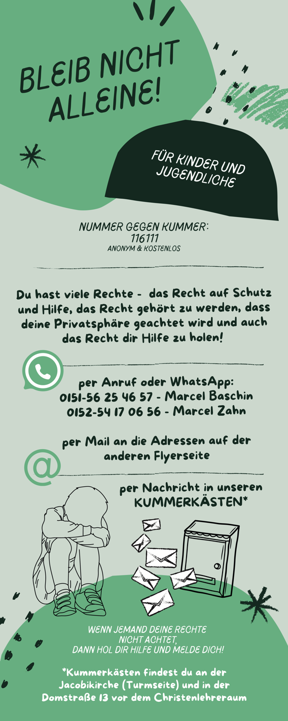 Wenn du dich per Brief melden möchtest nutze gern unsere Kummerkästen. Du findest sie an der Jacobikirche (Turmseite) und in der Domstraße 13 vor dem Christenlehreraum.